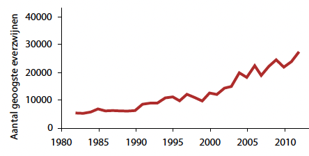 Aantal geoogste everzwijnen in Wallonië in de periode 1982 tot 2012 (© ELO)