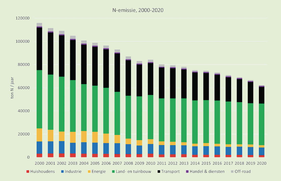 Evolutie van de emissie van stikstof (ton N j–1, totaal + per sector) in Vlaanderen tijdens de periode 2000–2020