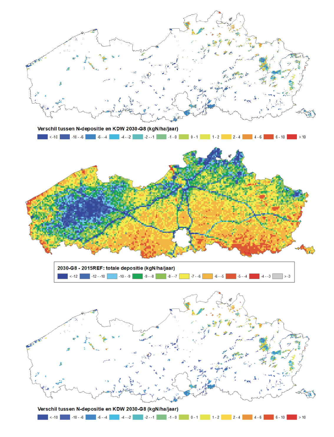 (boven) Stikstofdepositie in Vlaanderen in het zichtjaar 2030 onder G8-scenario. (midden) Verschil in stikstofdepositie tussen zichtjaar 2030 (G8) en PAS-referentiejaar 2015. (onder) Verschil tussen stikstofdepositie en de KDW voor stikstofgevoelige habitats in SBZ-H in 2030.