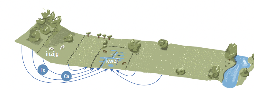 De plaats waar het water bovenkomt wordt een kwelzone of kwelgebied genoemd (zie sleuven en plassen in figuur 1 en 2). Dit in tegenstelling tot een inzijggebied waar het water in de bodem infiltreert. De planten in een inzijggebied hebben vooral de beschikking over zuur en arm regenwater. In een kwelgebied krijgen planten grondwater, waar eventueel kalk of ijzer in zijn opgelost. Het regenwater dat op een kwelgebied valt, blijft op het grondwater staan en wordt via greppels afgevoerd. De wortels krijgen dus vooral grondwater, wat mooie en soms zeldzame vegetatietypes geeft.