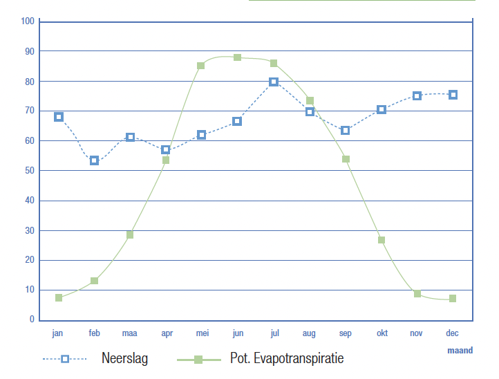 · 230 mm wordt opgenomen door de grond en wordt grondwater (bijna 1/3de van de neerslag),