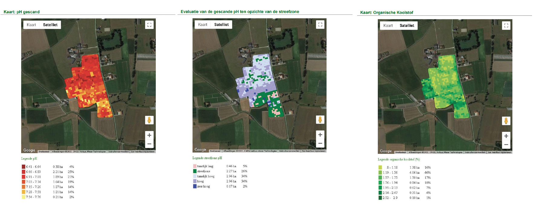 Wil je inzicht krijgen in de variatie van de pH, de organische koolstof en elektrische geleidbaarheid binnen je perceel en een advies ontvangen per 10m²? Laat dan je bodem scannen! De Veris bodemscan (foto 1) rijdt over het volledige perceel om zo op heel frequente basis deze parameters te meten. Per perceel worden ook algemene bodemanalyses uitgevoerd voor enkele plaatsen via manuele staalnames (voor kalibratie van de bodemscan). Door deze gegevens te combineren bekom je een gedetailleerde kaart (zie foto 2). De 3 linkse kaarten tonen het resultaat van de analyse, aan de hand waarvan een taakkaart (rechtse 2 kaarten) wordt gemaakt om plaatsspecifiek te bekalken en compost op te brengen.